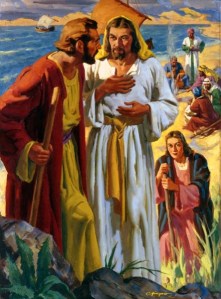 In this final chapter of John’s gospel, Jesus appears to seven of the disciples that have gone fishing on the Sea of Tiberias (Sea of Galilee). Appearing to them 100 yards from shore at daybreak, they did not recognize Him until they cast their net out where He told them – and then were unable to haul it in, so great was the catch (verse 6). John must have at once been reminded of the similar incident in Luke 5:4-6, as he exclaimed to Peter that “It is the Lord!” Peter, impulsive as usual, jumps in to swim to shore while the others drag the fish with the boat. Jesus had a fire going, and was cooking them breakfast. There have been many attempts to make some symbolic interpretation of the number of fish they caught (153) in verse 11, but fishermen naturally counted their fish before taking them to market. Verse 12 is simply an indication that even though they knew this was Jesus, the disciples were still getting used to the fact that He was alive again.