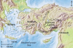 Paul and Barnabas, thrown out of Antioch in Pisidia, descended the mountains, going east into Lycaonia. They went first to Iconium, a commercial center on the road between Asia and Syria. After preaching there, they had to flee to Lystra, 25 miles south. Paul was stoned in Lystra, but he and Barnabas traveled the 50 miles to Derbe, a border town. The pair then boldly retraced their steps.