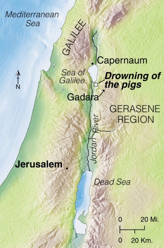 From Capernaum, Jesus and his disciples crossed the Sea of Galilee. A storm blew up unexpectedly, but Jesus calmed it. Landing in the region of the Gerasenes, Jesus sent demons out of a man and into a herd of pigs that plunged over a steep bank into the lake.
