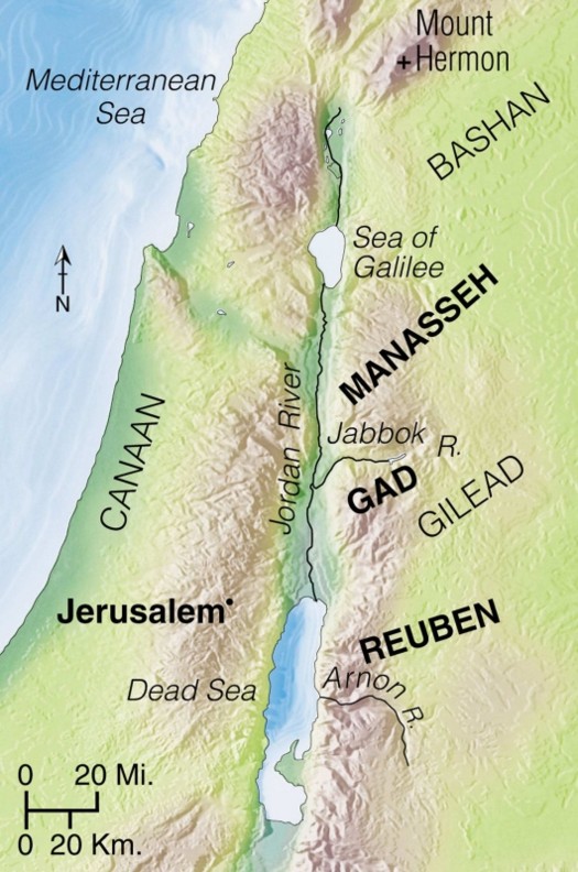 Joshua assigned territory to the tribes of Reuben, Gad, and to the half-tribe of Manasseh on the east side of the Jordan, where they had chosen to remain because of the wonderful livestock country.