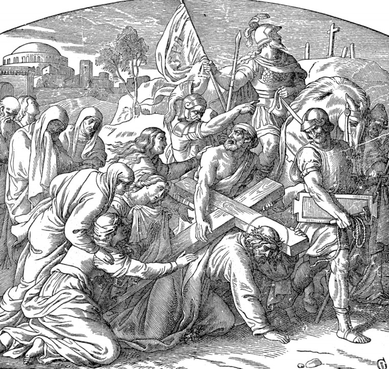 Simon of Cyrene is compelled to carry Jesus’ cross